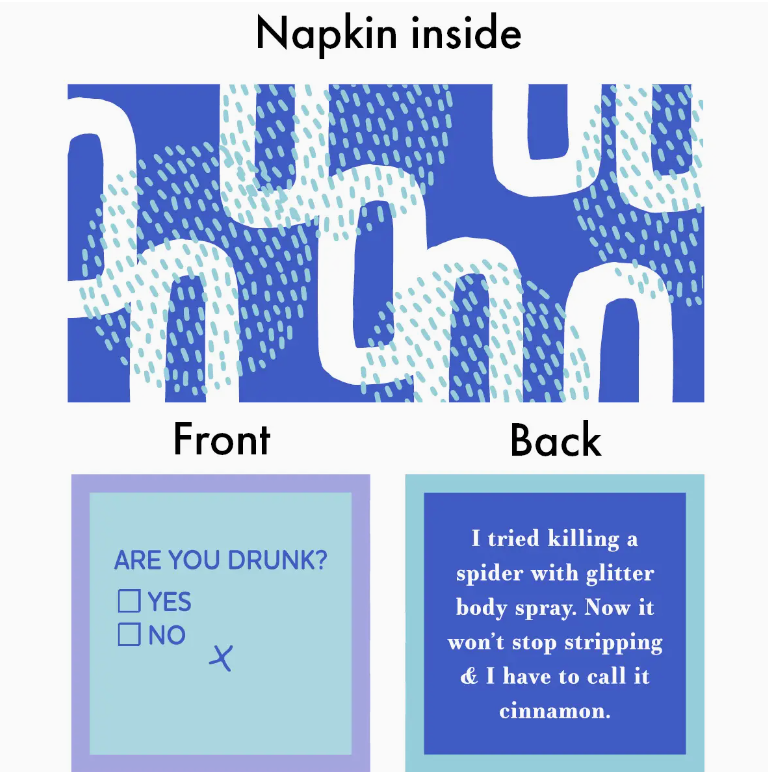 The cocktail napkin to add laughter to any gathering The original double sided napkin. Printing on both sides for extra fun. 5"x5" cocktail napkin 20 (3 ply) napkins in each package.